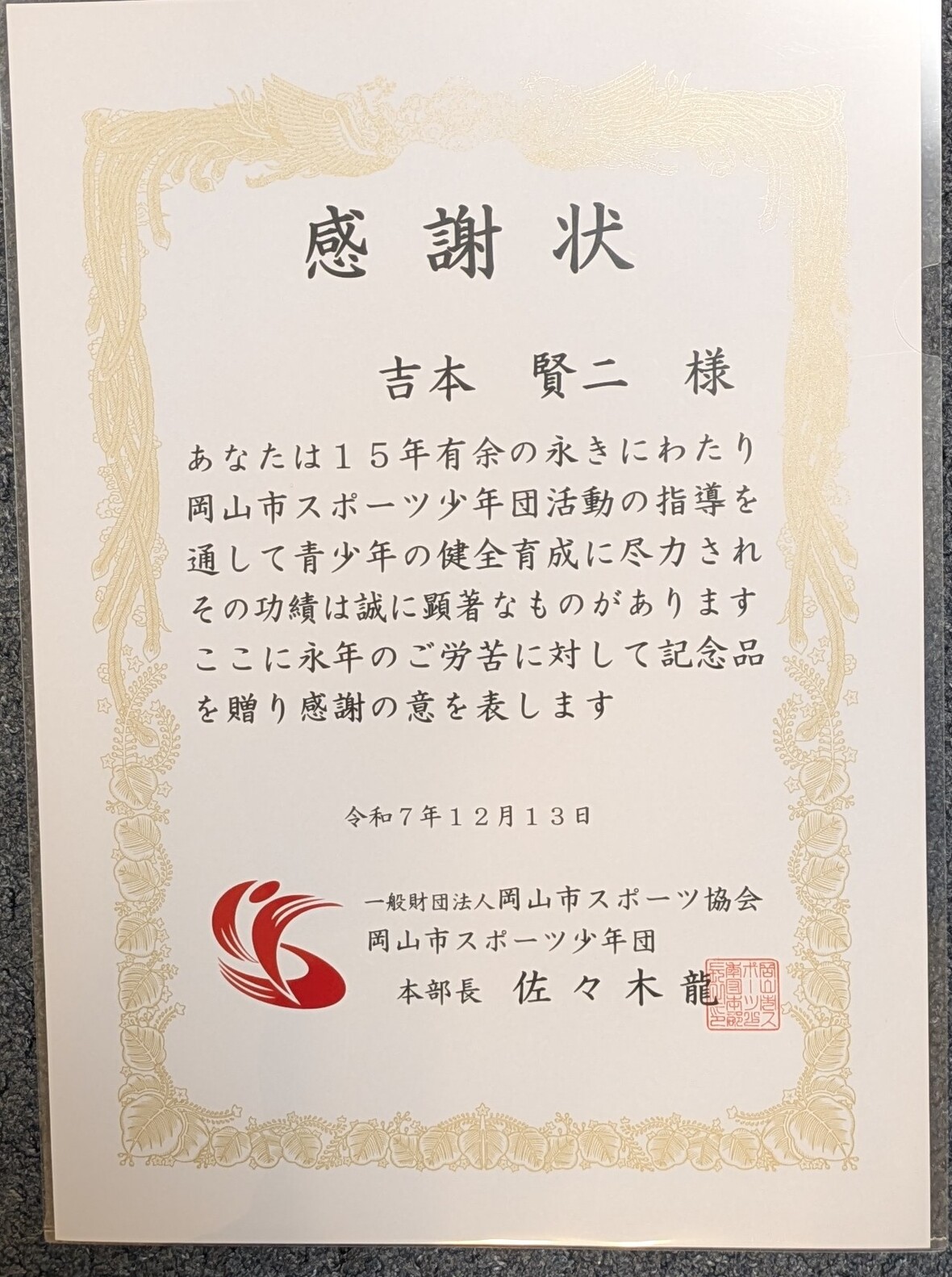 2025年12月13日(土) 活動日記 ミュージカル 朝よりグランドゴルフ大会へ。今年最後の大会より皆さんへ御礼を! その後、市民宅へ。地域の情報などを頂きました。 その後、ミュージカルへ。岡山の誇り木下サーカスの歴史『サーカス・サーカス 木下サーカス物語』をミュージカルで楽しみました。 その後、ソフトの練習へ。寒い中、みんな頑張っています。 その後、忘年会へ。スポーツ少年団関係者で今年の思い出を語りました。 感謝状を頂きました。これからも体力が続く限り、子ども達のために頑張ります!