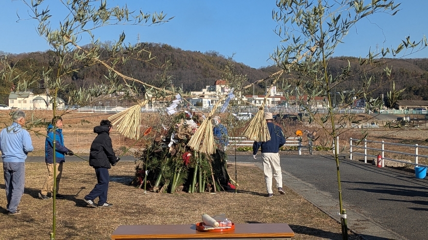 途中、どんど焼きへ。昨日とは違い風も穏やかで、地域の皆さんと『無病息災』を祈りました。