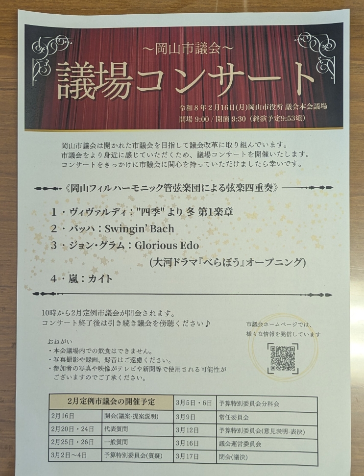 2026年02月16日(月) 活動日記 議場コンサート 朝より市役所へ。まずは議場コンサート。岡山フィルハーモニック管弦楽団の演奏を市民の皆さんと聞かせて頂き、感動!2回目が実現できたことも嬉しいです。 その後、2月議会初日へ。令和8年度予算など市長より所信表明の発表がありました。20日に代表を質問をするので、しっかり市民の皆さん意見を伝えていきます。 その後、勉強会・団総会へ。財政からの説明、情報交換など。 その後、打ち合わせ。市民相談の件を関係者へ伝え、打ち合わせ。解決できるだろうか・・・。