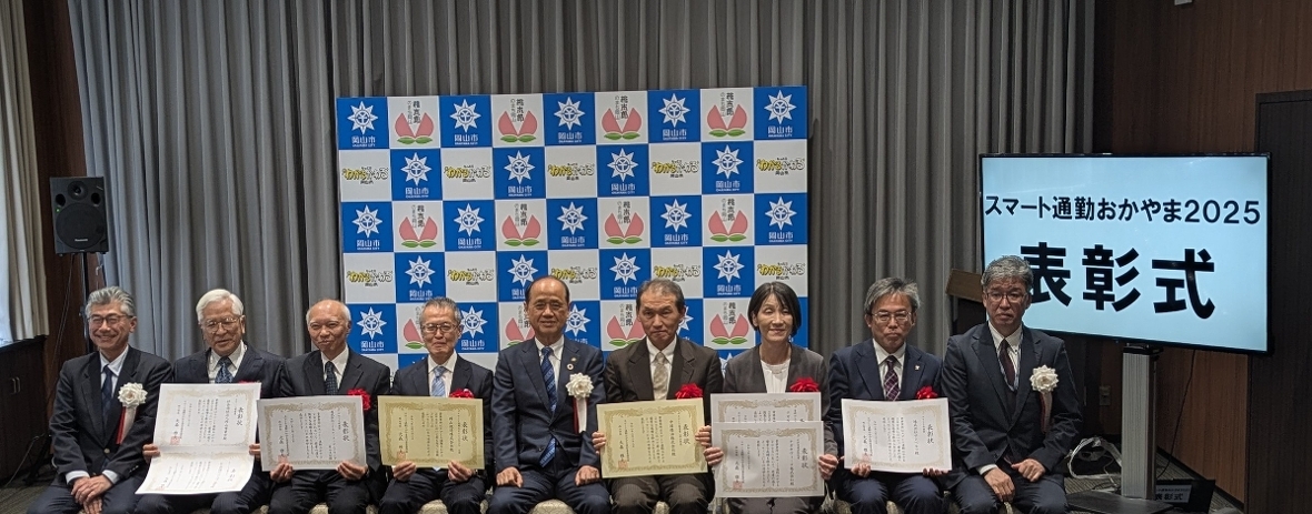 その後、表彰式へ。スマート通勤おかやま2025の受賞された企業の皆さんへ、表彰状を。CO2が削減されました。