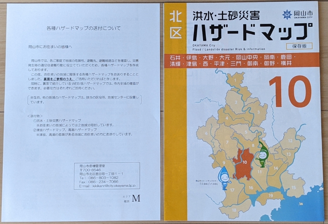 ハザードマップ 昨夜から大きな被害が予想されていた台風7号が上陸する朝、いつでも外出できる準備を。昨日届いたハザードマップを改めて見直しながら、被害が出ないことを祈りました。結果、全国で大きな被害が・・・。岡山市内においては強風のため木が倒れ通行止めになった情報などが・・・。水の被害は今の時点では聞こえてきませんが・・・。 終戦記念日の今日。絶対に戦争をしてはいけません。