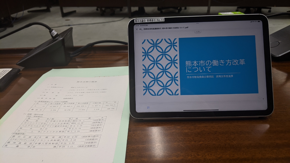 視察初日。熊本市で教育委員会の『働き方改革』について勉強。どこの先生も長時間労働が問題になっており、それに対し教育委員会は改善する対策をいろいろ考え実行しています。